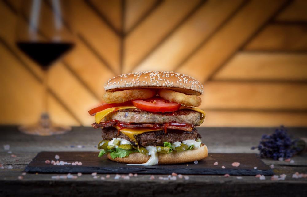 bun, beef (our own recipe), bacon, iceberg lettuce, pickles, Gouda cheese, cheddar cream cheese, crispy onions, gorgonzola cheese, jalapeno peppers, burger sauce, barbeque sauce.
