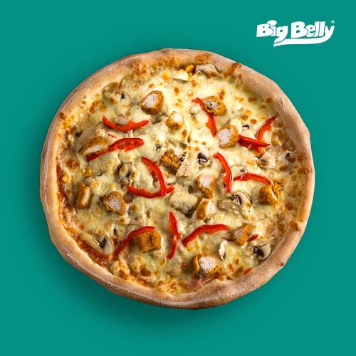 Sos de rosii, porumb, pui crocant, ciuperci, mozzarella, ardei gras