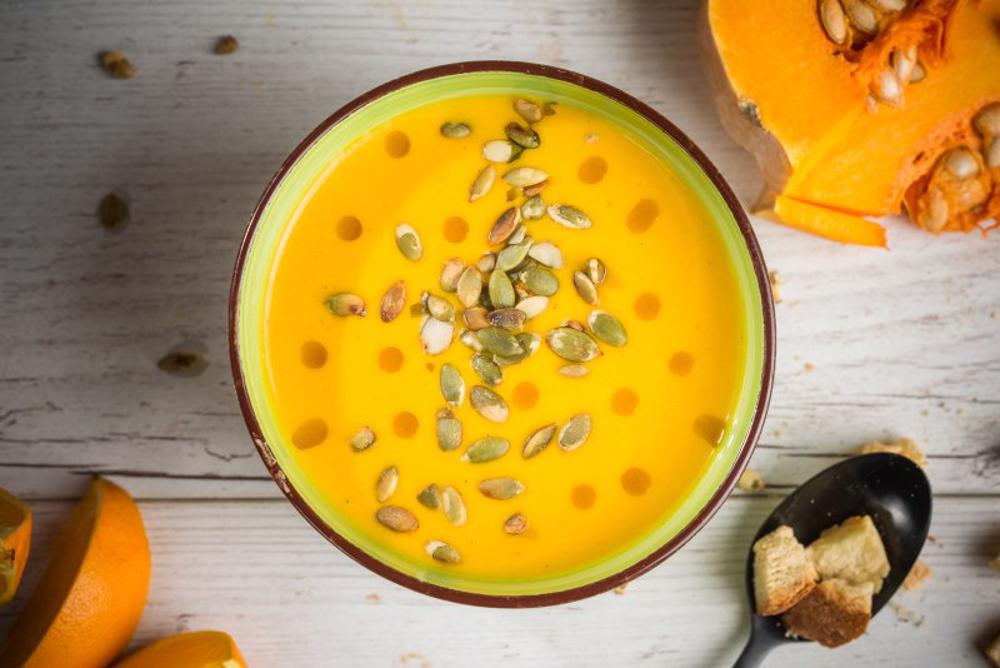 Ingrediente: Dovleac, morcov, portocala, ceapa, usturoi, smanatana vegetala, condimente, crutoane asezonate.
